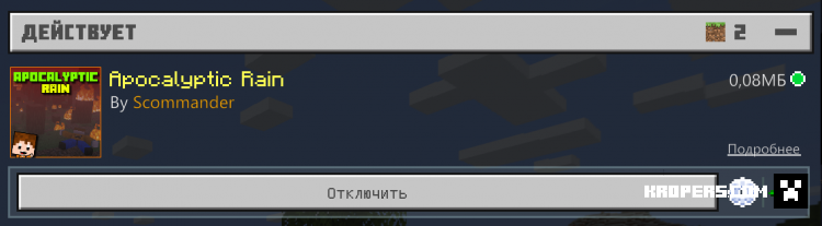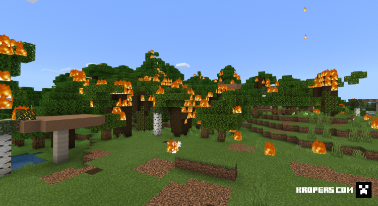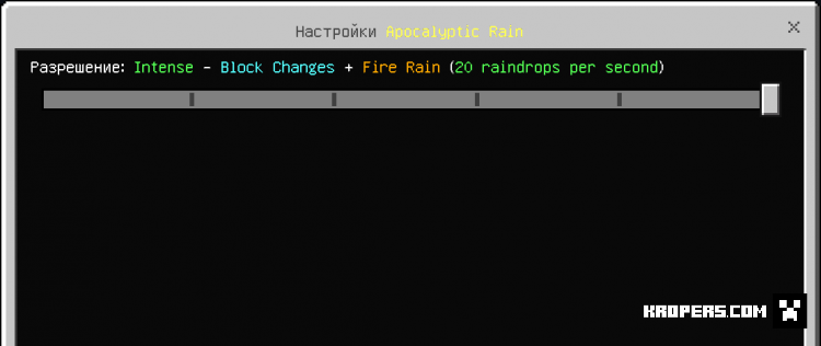 Мод добавит огненный дождь, который способен уничтожить все леса и деревни жителей, оно может убить даже вас (в случаи если вы на выживании) найдите укрытие чтобы спасти себя и друзей. Также в месте с модом входит настройка на котором станет возможно регулировать дождь, если ползунок передвинуть вниз - дождь будет идти тише, если передвинуть на максимальную - огненный дождь будет сильным. Не стоит ставить большой объём огненного дождя для слабый устройств/компьютеров.