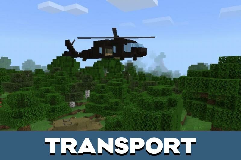 Among the models, players can find two helicopters. The first has six fighters on board, and the second has an attack radius of 50 blocks and the ability to shoot missiles.