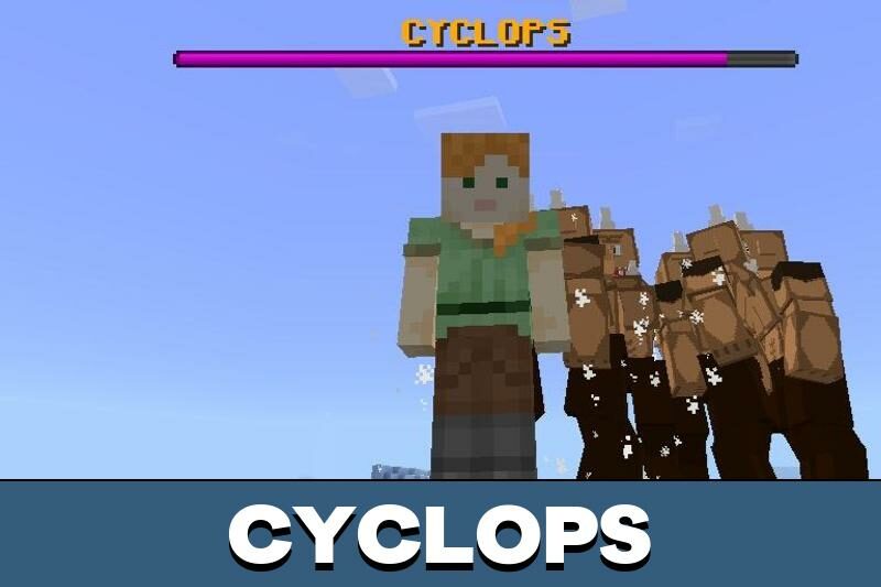 Mythical characters with one eye will spawn in the Minecraft PE game world immediately after installing the mod. Cyclops has a health of 2100 and damage of 15. Creatures have high growth and can attack in different ways. It is difficult to fight them. Mobs can also summon meteorites.