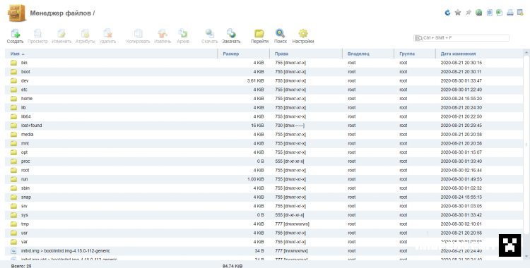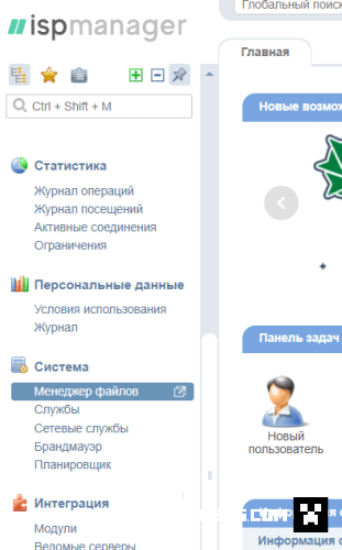 После скачивания, переходим в панель управления сервером (мы используем ISPmanager) и заходим в менеджер файлов: