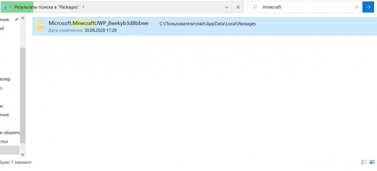 3. Найди папку с названием Microsoft.MinecraftUWP_8wekyb3d8bbwe удали его, полезный совет: Если папку сложно найти, используй поиск введя «minecraft». Если папка не обнаружена, значит папка удалилась.