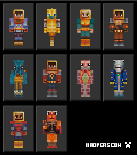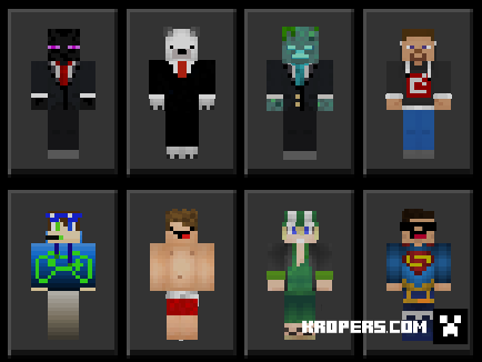 Данный набор Minerealm Studio, добавит более пятнадцати качественных скинов от автора, в наборе вы увидите скин Супер-мэна, серьёзные скины, скин с логотипом Mojang, строительных скинов, странных скинов и многих других наборов вы узнаете только после скачивания. Примерьте все скины и не забудьте поделиться данным материалом с друзьями.