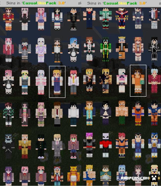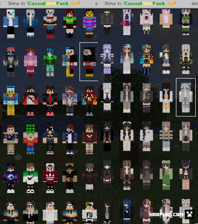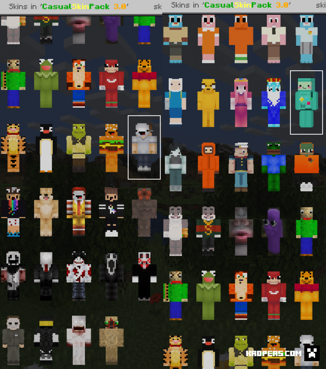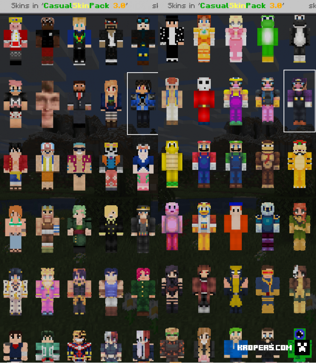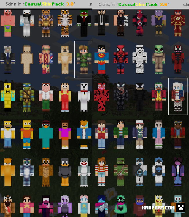 В этом наборе вам будет доступно более 500 скиной под разными категориями, мы будем уверены, что из этого набора вам может понравится хоть один скин-пак. В данном пакете вы можете заметить популярных персонажей из мультфильмов и сериалов, скины для девочек и мальчиков, рождественские, мем скины, известные певцы и многое другое. Для хорошей работы скинов у вас должна быть более свежая версия Minecraft, все скины выполнены уникальным образом, без лишних помарок и ошибок. Этот пакет скинов продолжает своё существование с крутыми обновлениями.
