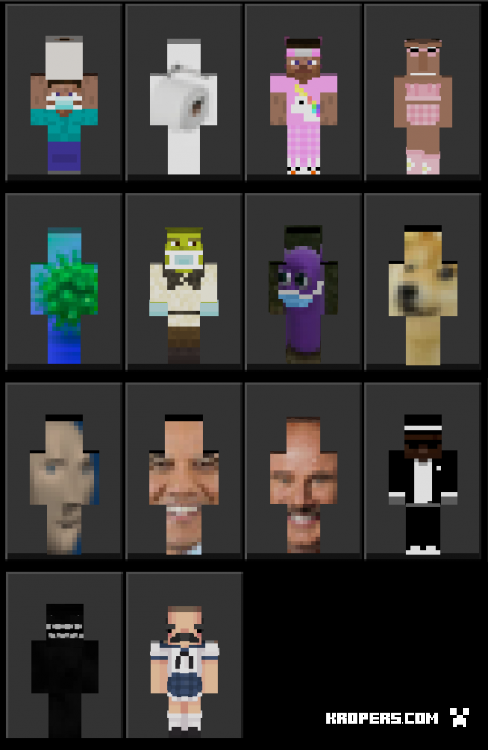 В этом комплекте вы увидите тридцать шесть странных скинов, ниже вы можете посмотресь все скины, есть скин с маской, чтобы не заразится от коронавируса в майнкрафт, есть скин танцоров, которые танцуют под музыку Coffin Dance, на 2020 год он стал мемом. Также вы увидите скин известный персонажей таких как Барак Обама (прежний президент США), шрека и собаку Doge (интернет-мем). Пользуйтесь этими скинами и удивляйте своих друзей!