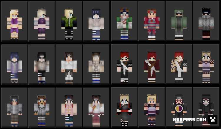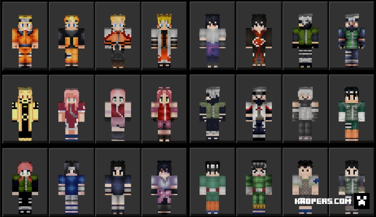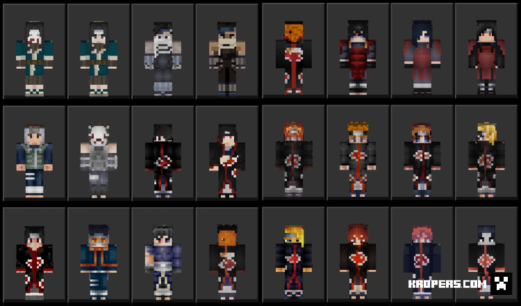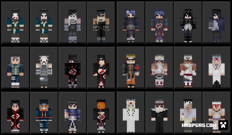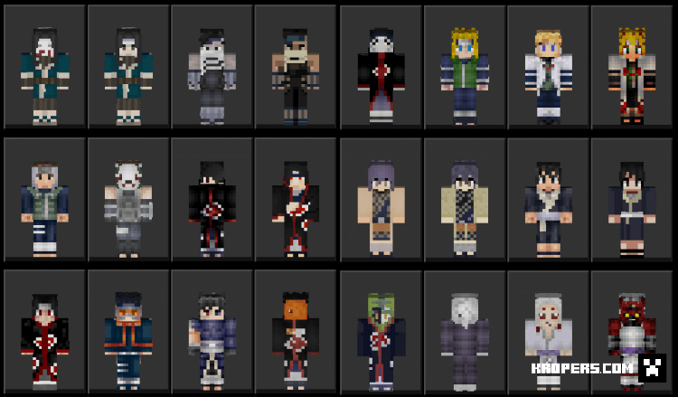 Данный Скин-пак добавляет в Майнкрафт, около ста скинов взятых с Naruto Shippuden и Naruto Classic, если вы являетесь небольшим фанатом Naruto, рекомендуем установить их и оценить, скины выполнены качественно и очень ярко.